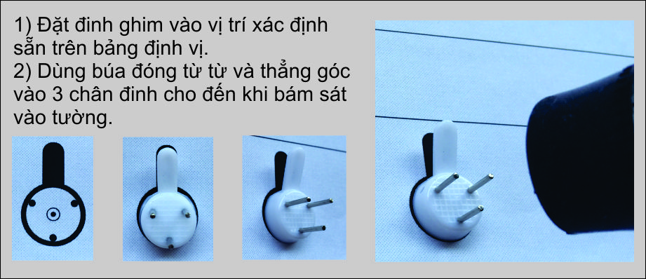 Bước 2: Đóng đinh ghim treo tường vào vị trí đã được xác định trên bảng vẽ định vị. Chú ý chỉ cần đóng nhẹ nhàng, từ từ cho đến khi 3 đinh ghim sát tường và chắc chắn. Việc đóng đinh ghim rất nhẹ nhàng, phụ nữ cũng làm được.